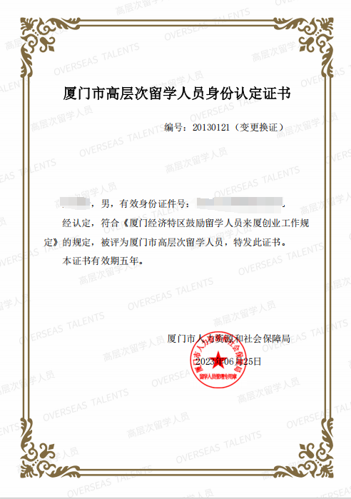 廈門市高層次留學人員身份認定證書