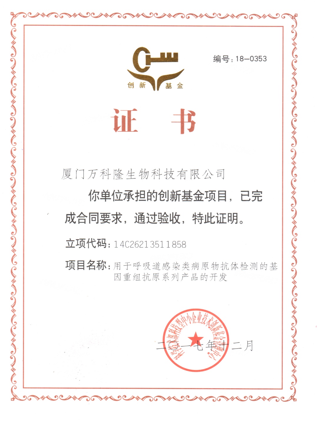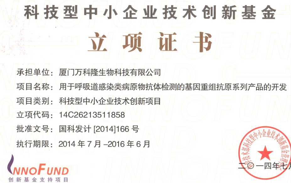 科技型中小企業(yè)技術創(chuàng)新基金立項證書