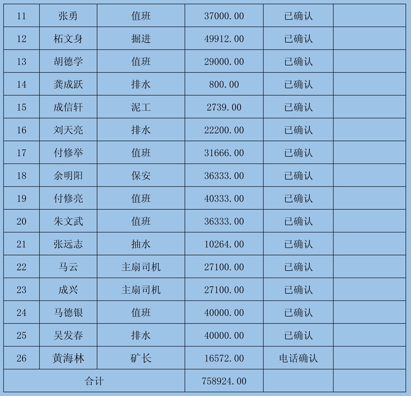 2、本次確認(rèn)情況:經(jīng)初核確認(rèn),累計(jì)共收到25條欠薪證據(jù),涉及25人742352元;勞資雙方已簽字蓋章確認(rèn)25條欠薪證據(jù);經(jīng)法人陽建華電話確認(rèn)1人16572元。煤礦方提供確認(rèn)名冊(cè)一份,其他50名欠薪人員存在以下說明:3名人員證據(jù)不足無法確認(rèn)、10名(兩個(gè)工隊(duì))待法院判決后再確認(rèn)、16名人員欠薪已支付、21名人員由于證據(jù)不足無法確認(rèn)。