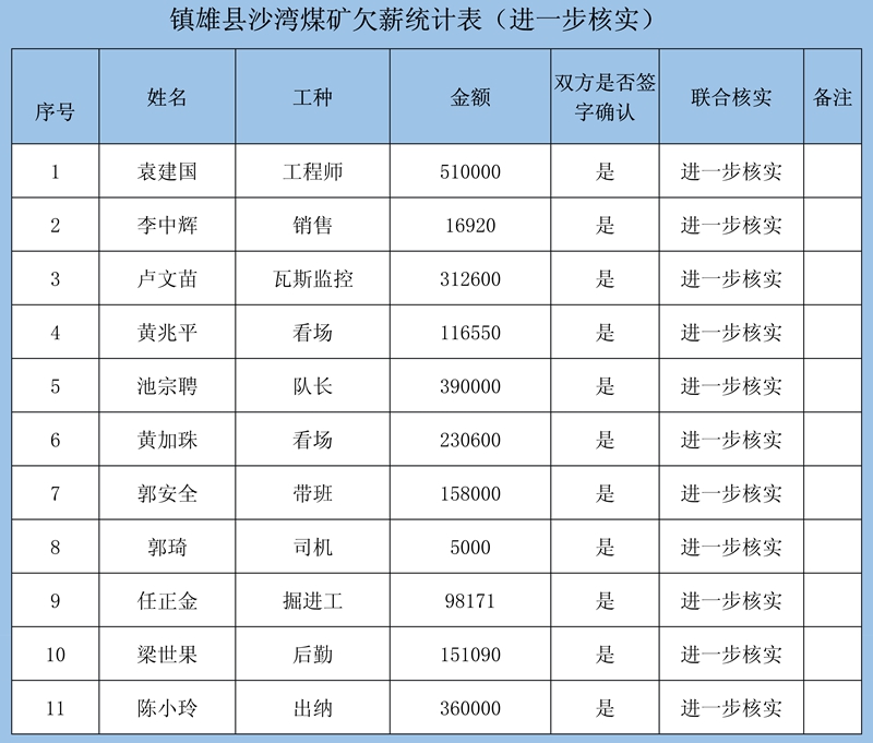 3、其他情況:登記確認(rèn)過程中魏華、楊光明兩個(gè)工隊(duì)提供欠薪相關(guān)證據(jù),但由于兩個(gè)工隊(duì)的上級(jí)主管歐秀坤已向法院提起訴訟,于2021年7月23日開庭,煤礦表示不知道歐秀坤的訴訟里面是否含兩個(gè)工隊(duì)的欠薪,待查明情況后再做確認(rèn)。