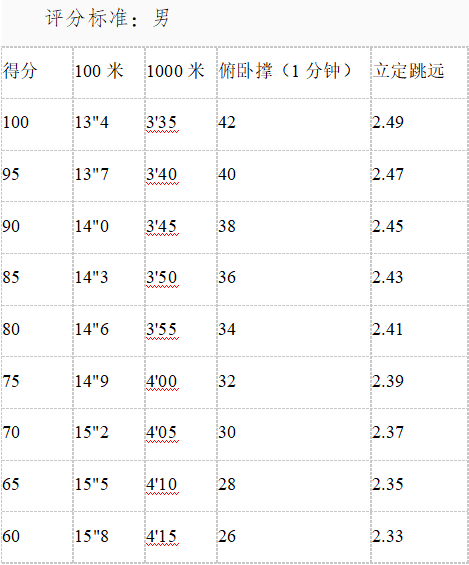 男:100米,1000米,俯臥撐,立定跳遠(yuǎn)