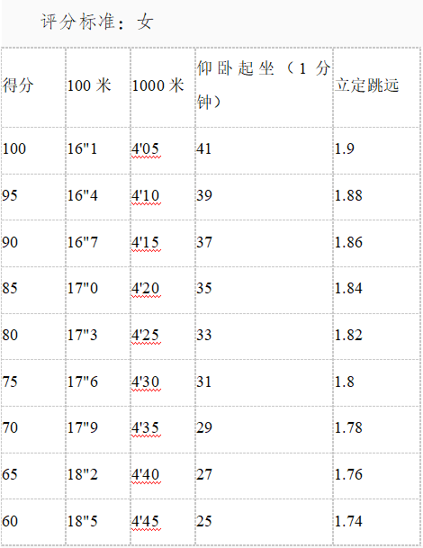 女:100米,1000米,仰臥起坐,立定跳遠(yuǎn)
