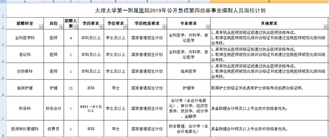 因工作需要,大理大學第一附屬醫(yī)院面向社會公開急招第四批非事業(yè)編制工作人員29名,現(xiàn)將有關招聘事宜公告如下: