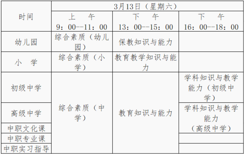 報考小學(xué)“心理健康教育”、“信息技術(shù)”、“小學(xué)全科”,初級中學(xué)、高級中學(xué)“心理健康教育”學(xué)科的考生,筆試僅開考科目一和科目二,其科目三(學(xué)科知識與教學(xué)能力科目)結(jié)合面試一并考核。“日語”、“俄語”學(xué)科結(jié)合我省實際,暫不開考。
